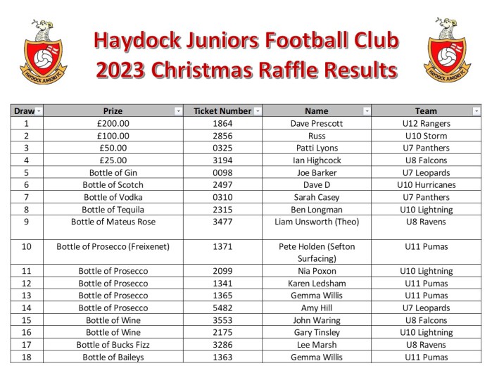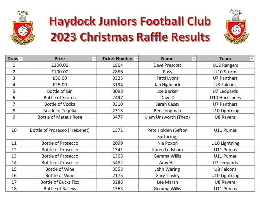 The players and coaches would like to thank everyone who participated in this years Christmas Raffle.